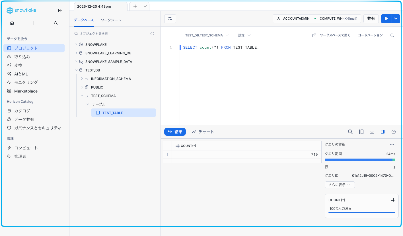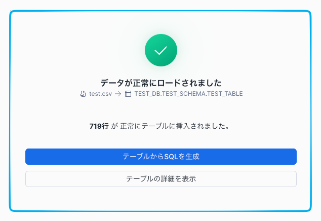 これでロードが完了、テストデータの719行のデータが無事に TEST_DB.TEST_SCHEMA.TEST_TABLE へ格納されました。