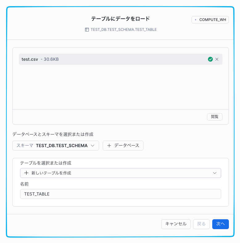 アップロードが完了するとファイル名が表示されるので、画像下部の 「名前」 と書かれたすぐ下の空の入力欄に、作成したいテーブルの名前(例:TEST_TABLE など)を入力してください。右下の [次へ] をクリックします。