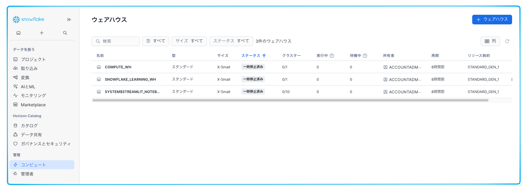 ウェアハウスが3つならんでいます。これはSnowflakeが最初から親切に用意してくれたものと自動で作られたものです。今回はCOMPUTE_WHを使います。